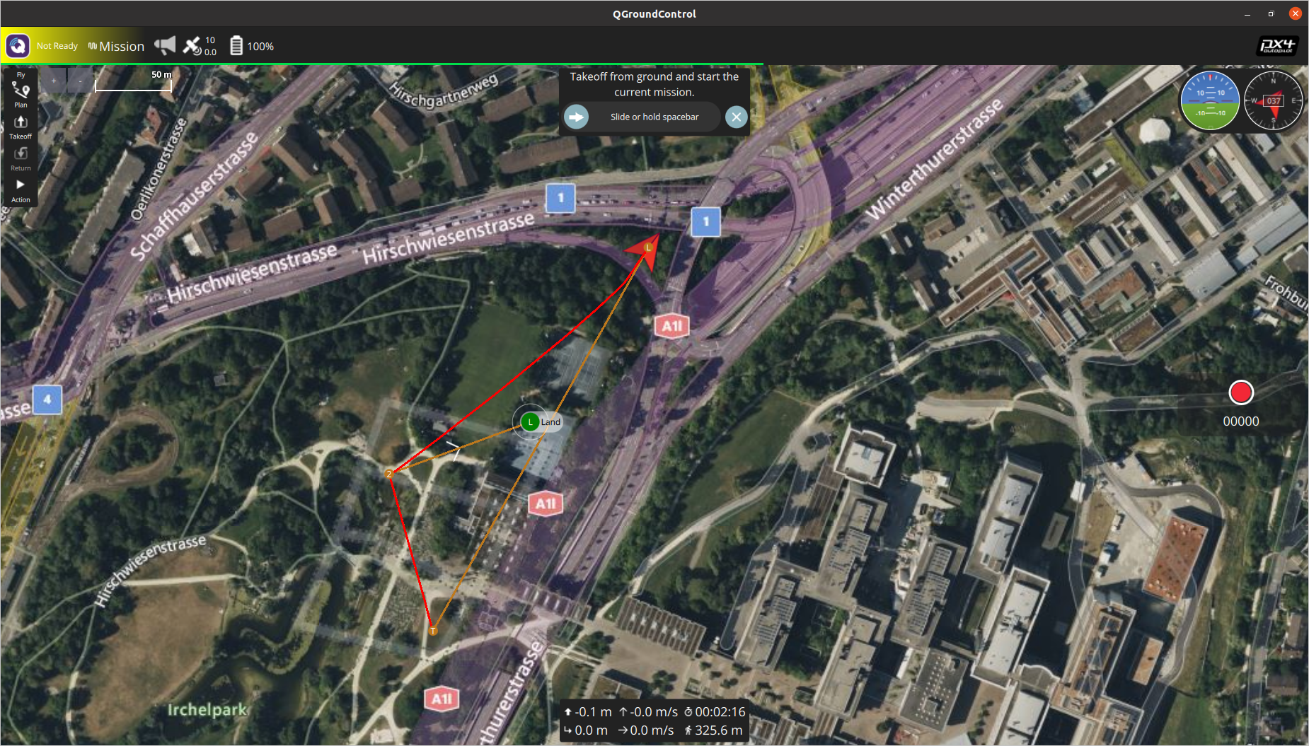 仿真采用PX4自带的 iris 四旋翼无人机模型,用 QGC 地面站预先规划航迹:起飞(黄色T点)——途经(2号点)——降落(绿色L点)。我们假设L点为移动平台初始位置,并假设平台以经纬度均为0.000005 度/秒的速度移动(约0.6-0.8 m/s),实际运行效果如下所示: