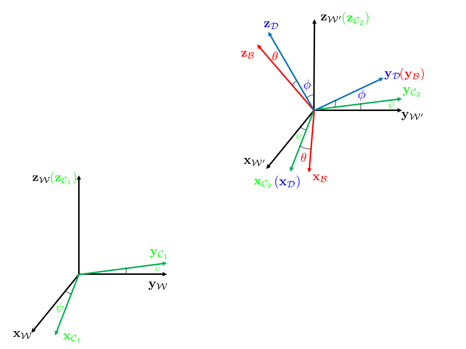 规定三个坐标系,一个世界坐标系 \(\{\mathcal{W}\}\),一个机体坐标系 \(\{\mathcal{B}\}\),四个中间过渡用的坐标系: \(\{\mathcal{W}'\}\),\(\{\mathcal{C}_1\}\) 和 \(\{\mathcal{C}_2\}\) 以及 \(\{\mathcal{D}\}\).
