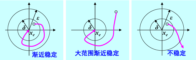 如果这个自治系统不管初始状态是什么,最后状态都能收敛到 \(x_e\),那么称 \(x_e\) 是大范围渐近稳定的。
